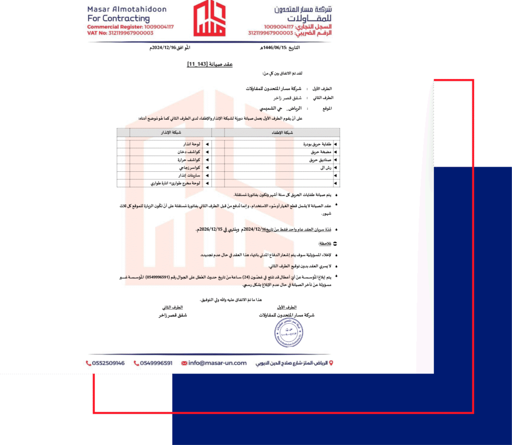 نحن متخصصون في تقديم الخدمات الخاصة بعقود صيانة أنظمة السلامة لمشاريع متنوعة. تتميز خدماتنا بالدقة والاحترافية، مما يضمن تنفيذ العقود بشكل مثالي وبجودة عالية.